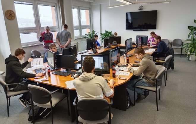 Skupina studentů SPŠ Ostrava pracuje na školním projektu v týmu před vchodem do školy s certifikáty v rukou